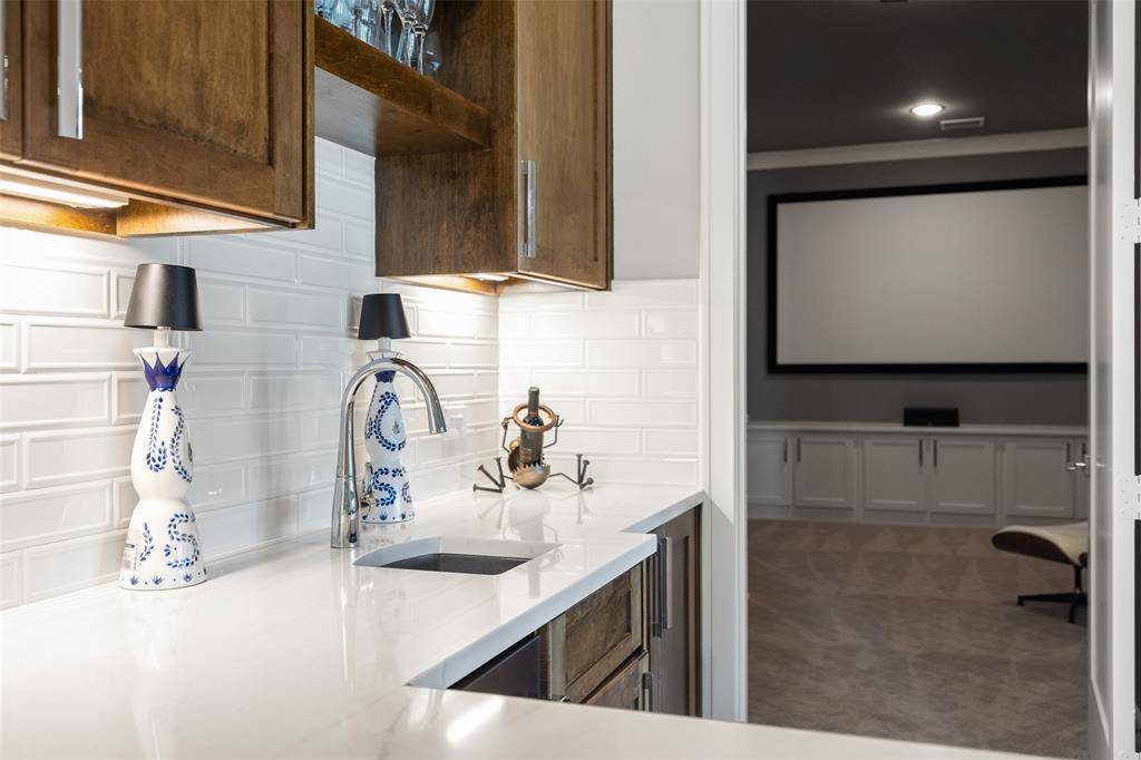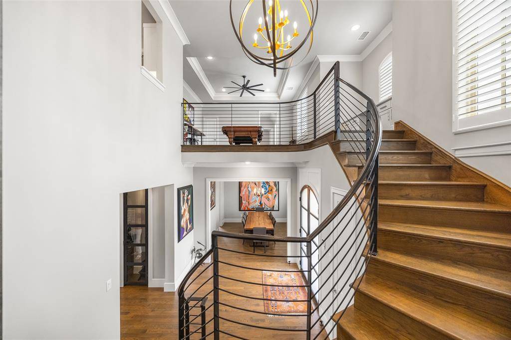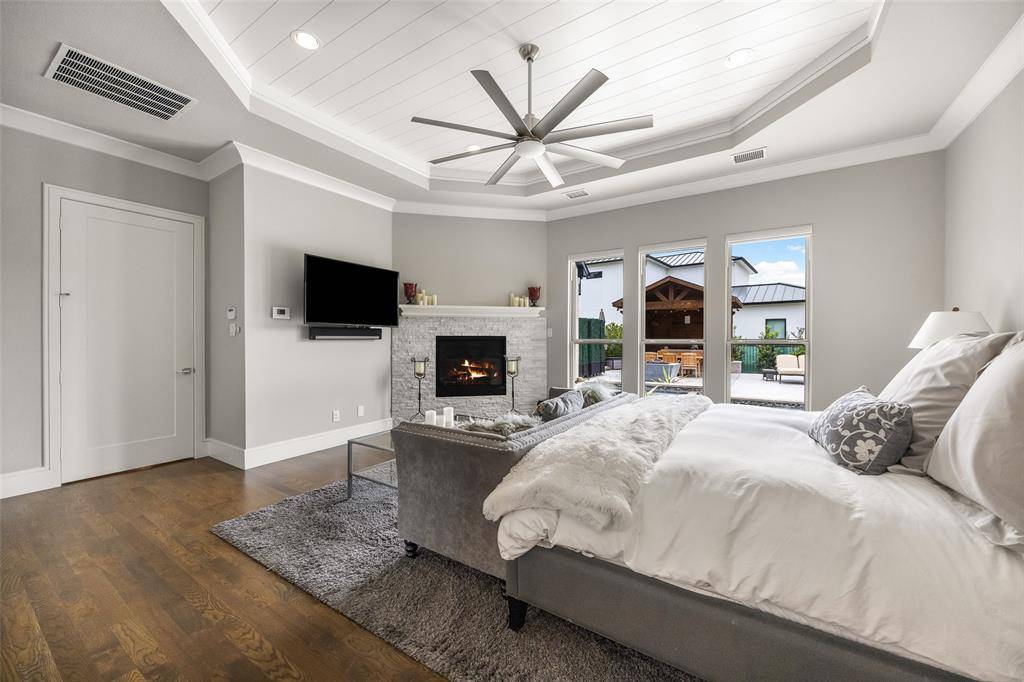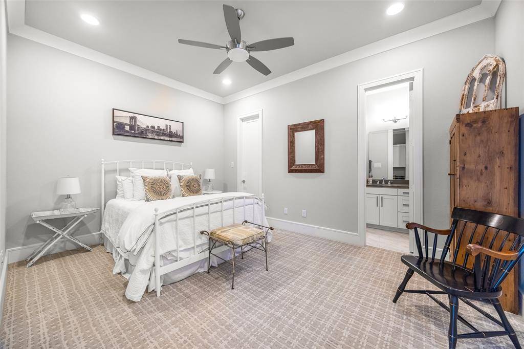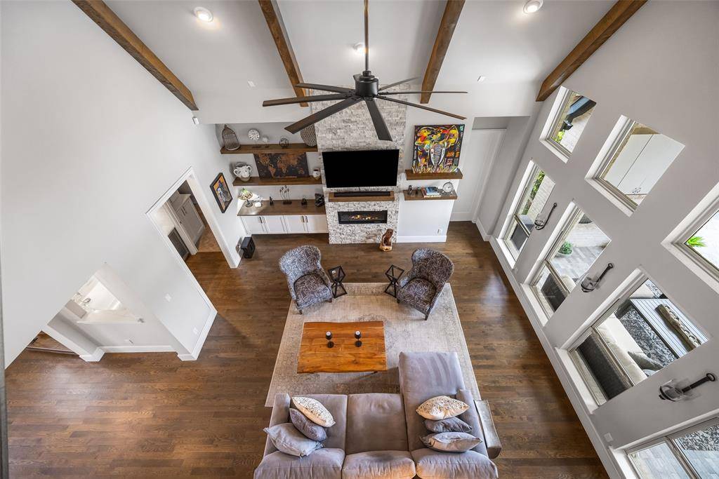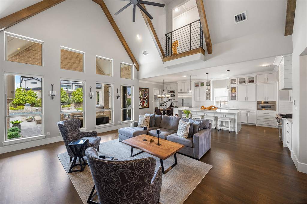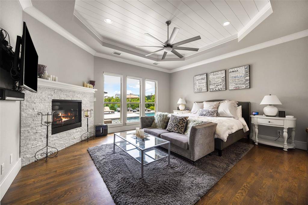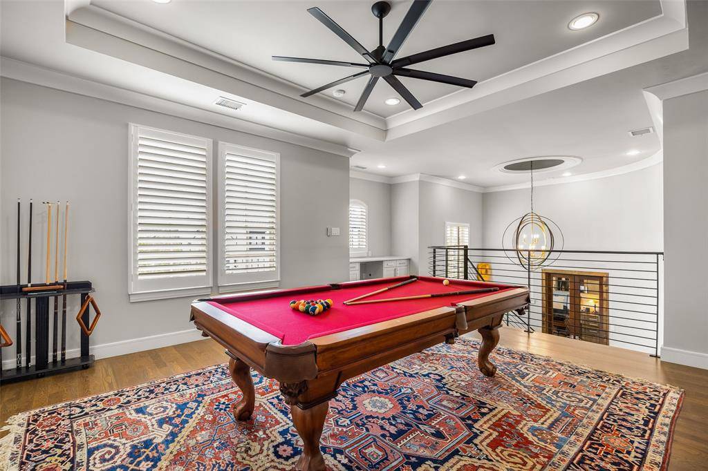 Welcome to refined luxury living in the prestigious, guard-gated community of The Hills of Kingwood. Built by Tom Miller of Oak Creek Custom Homes, this exceptional residence blends timeless craftsmanship with modern elegance. From the moment you arrive, the stately curb appeal & manicured landscaping set the tone for what awaits inside. Step into a stunning living room featuring soaring vaulted ceilings with exposed wood beams, rich wood flooring, custom built-ins, & a dramatic floor-to-ceiling stackstone fireplace. Walls of windows frame picturesque views of the backyard oasis & seamlessly connect to the open-concept chef's kitchen. Designed for entertaining, the kitchen showcases a large island, Thermador commercial-grade gas range, pot filler, built-in refrigerator, microwave, & dishwasher. The home offers elegant & functional spaces throughout, including a formal dining room, large wine closet, & a wet bar with icemaker & wine refrigerator leading into a fully equipped media room—perfect for movie nights with all equipment included. A private study, located midway up the staircase, features custom woodwork & a beautifully detailed ceiling. The luxurious primary suite offers a tray ceiling, cozy fireplace, electric shades, & serene pool views. The spa-inspired bath includes dual vanities, soaking tub, walk-in shower with seating, & a custom closet. Designed with comfort & privacy in mind, all secondary bedrooms are en suites, including a convenient downstairs guest suite. Upstairs, enjoy a spacious game room with wet bar & refrigerator, along with additional en suite bedrooms & a second primary suite. Step outside to your private retreat—an outdoor living space complete with fireplace, built-in grill, sink, icemaker, refrigerator, & two TVs included. The saltwater pool & spa, built by Riverbend Sandler in 2020, features a tanning ledge & is complemented by a cabana and low-maintenance turf. Experience elevated living in this exceptional Frisco home.