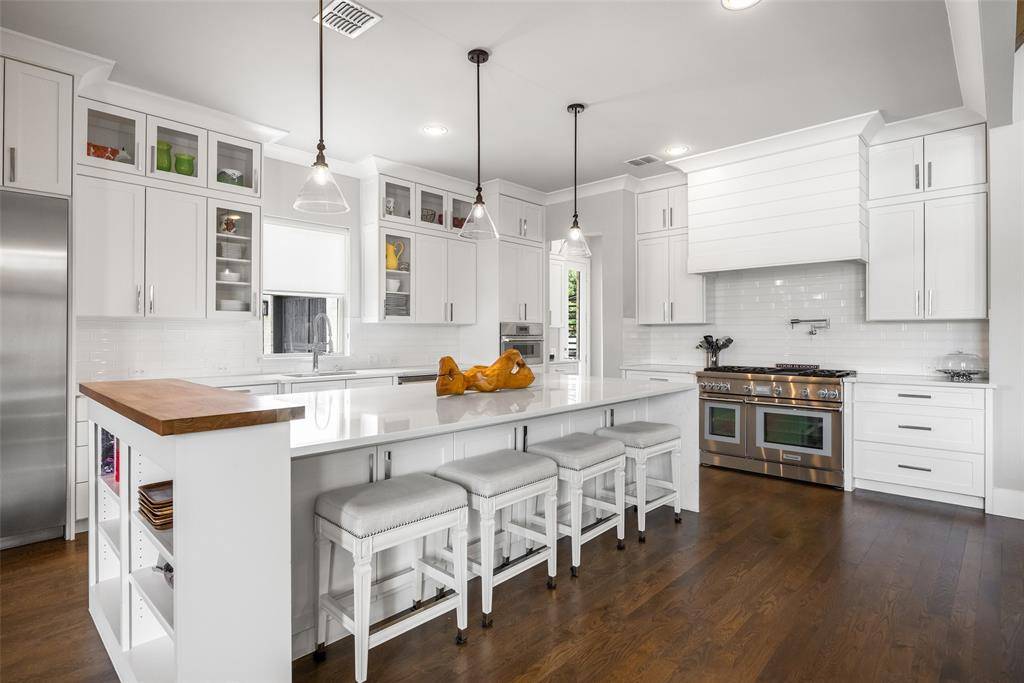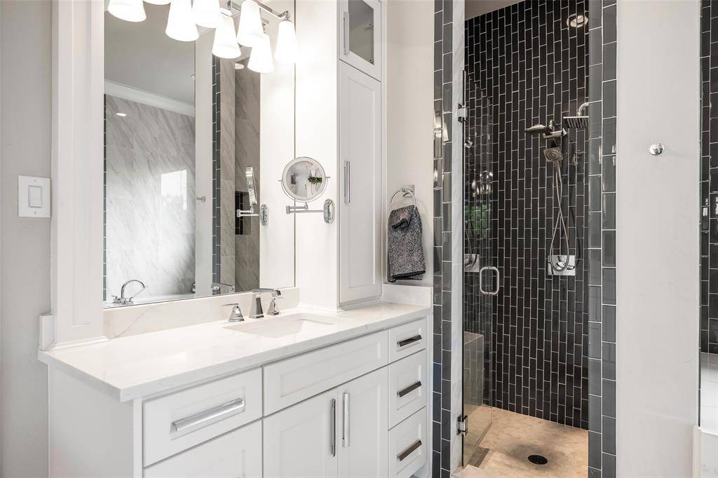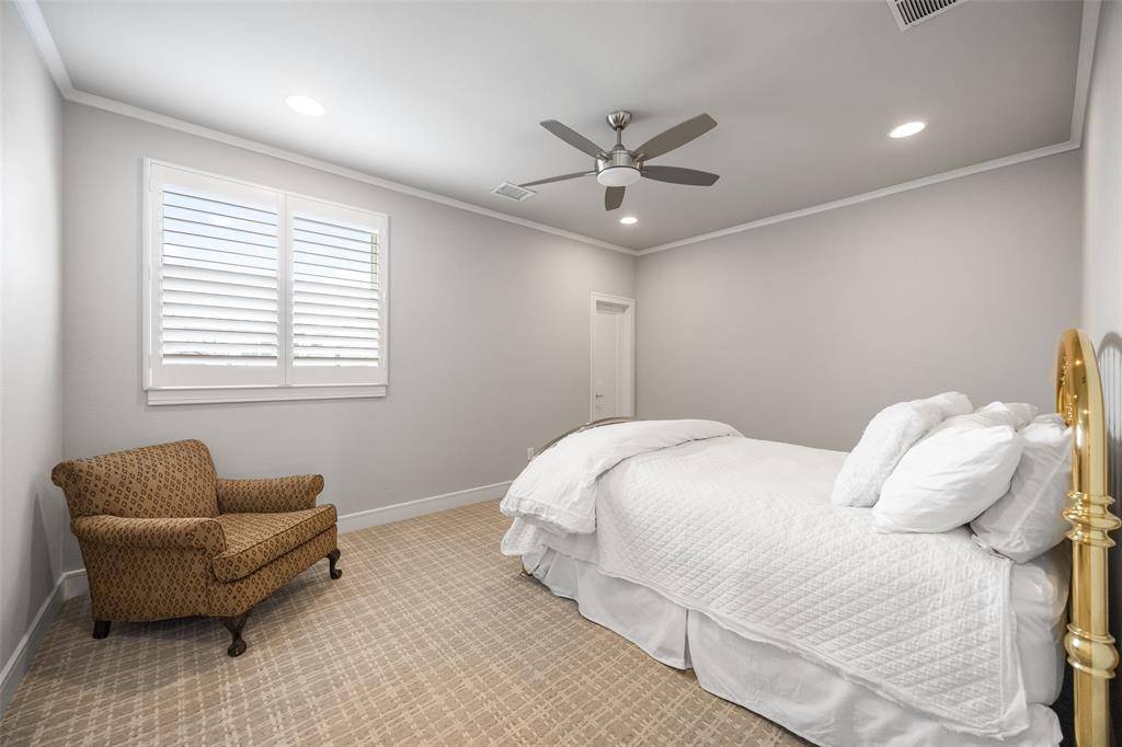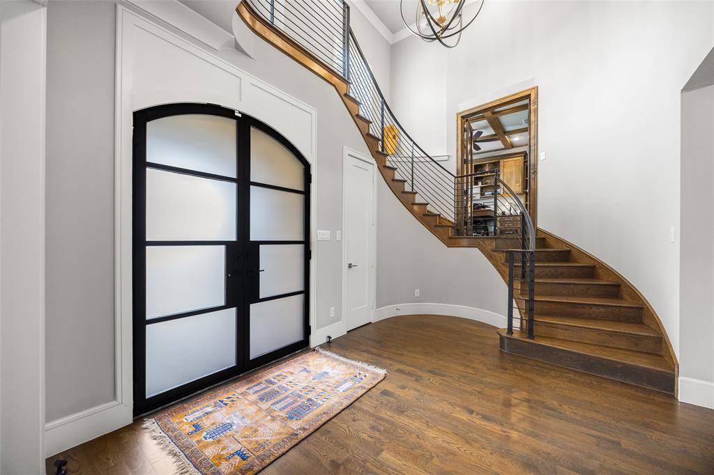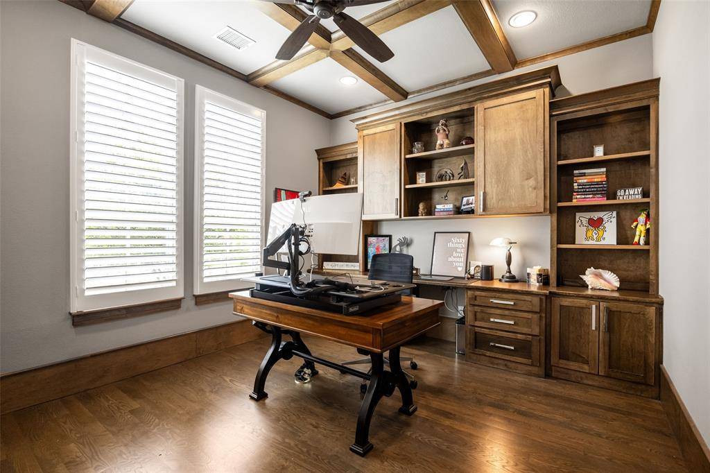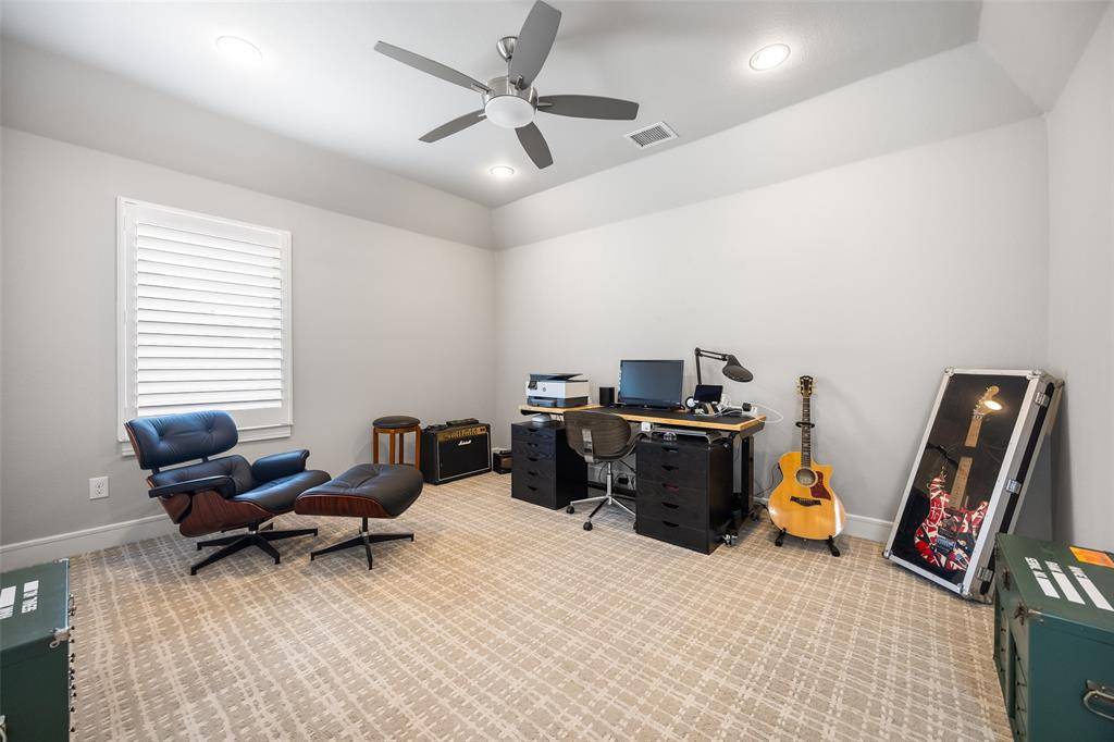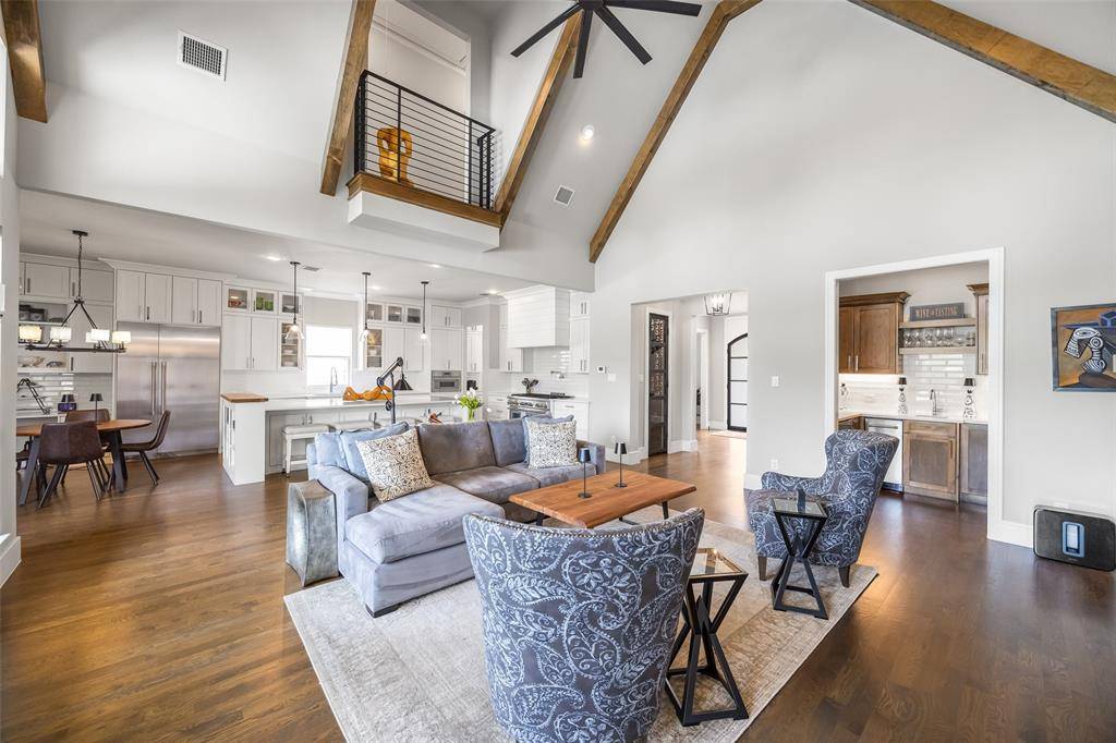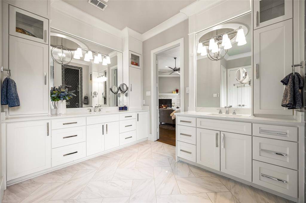 Welcome to refined luxury living in the prestigious, guard-gated community of The Hills of Kingwood. Built by Tom Miller of Oak Creek Custom Homes, this exceptional residence blends timeless craftsmanship with modern elegance. From the moment you arrive, the stately curb appeal & manicured landscaping set the tone for what awaits inside. Step into a stunning living room featuring soaring vaulted ceilings with exposed wood beams, rich wood flooring, custom built-ins, & a dramatic floor-to-ceiling stackstone fireplace. Walls of windows frame picturesque views of the backyard oasis & seamlessly connect to the open-concept chef's kitchen. Designed for entertaining, the kitchen showcases a large island, Thermador commercial-grade gas range, pot filler, built-in refrigerator, microwave, & dishwasher. The home offers elegant & functional spaces throughout, including a formal dining room, large wine closet, & a wet bar with icemaker & wine refrigerator leading into a fully equipped media room—perfect for movie nights with all equipment included. A private study, located midway up the staircase, features custom woodwork & a beautifully detailed ceiling. The luxurious primary suite offers a tray ceiling, cozy fireplace, electric shades, & serene pool views. The spa-inspired bath includes dual vanities, soaking tub, walk-in shower with seating, & a custom closet. Designed with comfort & privacy in mind, all secondary bedrooms are en suites, including a convenient downstairs guest suite. Upstairs, enjoy a spacious game room with wet bar & refrigerator, along with additional en suite bedrooms & a second primary suite. Step outside to your private retreat—an outdoor living space complete with fireplace, built-in grill, sink, icemaker, refrigerator, & two TVs included. The saltwater pool & spa, built by Riverbend Sandler in 2020, features a tanning ledge & is complemented by a cabana and low-maintenance turf. Experience elevated living in this exceptional Frisco home.