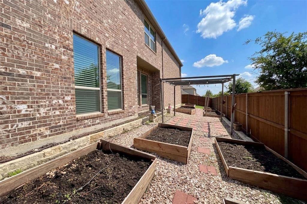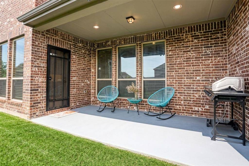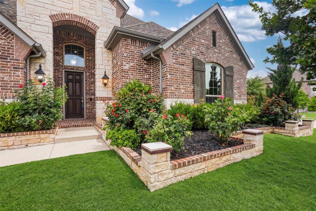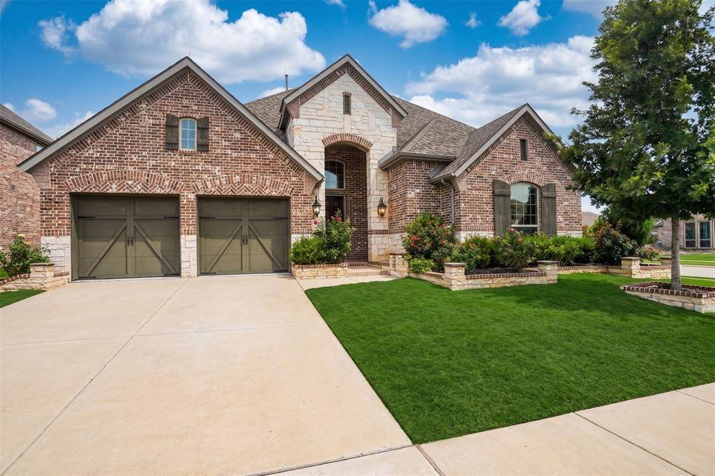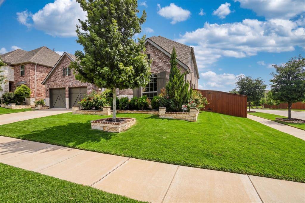 Stunning East facing home on a premium corner lot in the highly sought-after Prairie View community in Frisco, zoned to top-rated Prosper ISD schools! Upon entering, this home welcomes everyone with abundant natural light! The open floor plan features hardwood flooring throughout the main living areas, a formal dining room with views of the side yard with pergola, and a private office with glass French doors and a closet. The spacious living room offers a cozy fireplace and is pre-wired for 5.1 surround sound, creating the perfect gathering space. The chef's kitchen is a true centerpiece with granite countertops, an oversized island with sink, double ovens, chimney hood, pot filler, walk-in pantry, and a butler's pantry perfect for your coffee station. The first-floor primary suite is a relaxing retreat with a soaking tub, separate shower, and large walk-in closet. A guest suite with a private bath is also located downstairs, while upstairs features 3 additional bedrooms, 2 more full bathrooms, plus a game room with wet bar provisions and a media room pre-wired for 11.1 surround sound. Additional highlights include dual HVAC systems, water softener system, advanced hot water system, pre-wired security cameras, alarm system, and WiFi-enabled garage doors. The 3-car tandem garage features epoxy flooring, storage racks, and utility connections. Step outside to enjoy a covered patio with gas line, pergola with solar lighting, raised garden beds with drip irrigation, and a beautifully maintained yard with mature trees. This home is also protected with professionally installed lightning rods for extra safety during stormy Texas days. Enjoy the fantastic community amenities including a resort-style pool with splash pad, covered pavilion, multiple playgrounds, and three parks. Ideally located just minutes from the Dallas North Tollway, Highway 380, and less than 10 minutes from the PGA Headquarters, with easy access to shopping, dining, and entertainment!