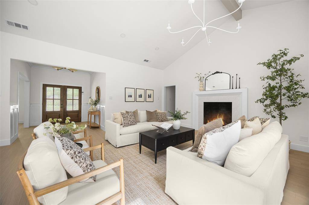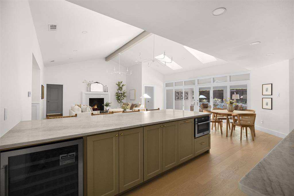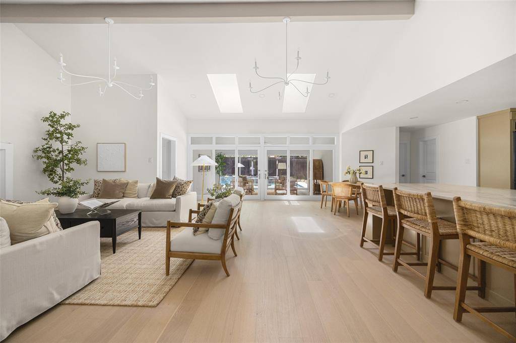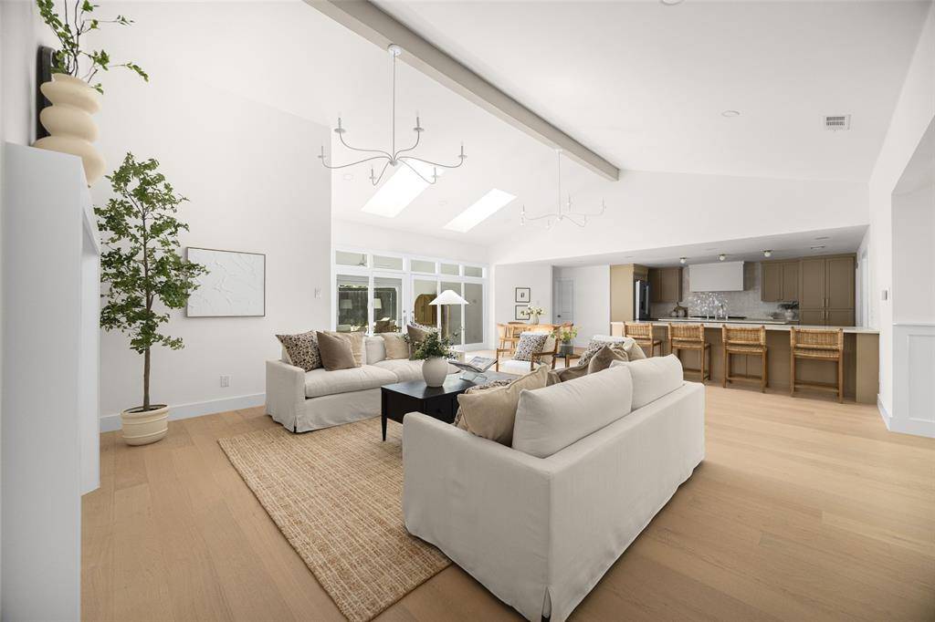 Renovated and thoughtfully reimagined by Maverick Design, this stunning 5-bedroom, 3-bathroom home offers the perfect blend of elevated design and everyday functionality. A bright, open-concept floor plan creates effortless flow, anchored by a grand eat-in chef's kitchen featuring a double island, custom vent hood, and new stainless steel appliances. The kitchen seamlessly overlooks the inviting living space, highlighted by soaring vaulted ceilings, a statement fireplace, and picturesque views of the sunroom and backyard beyond.
