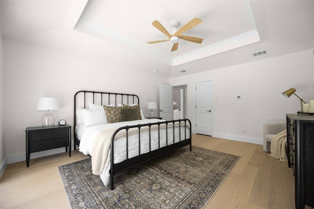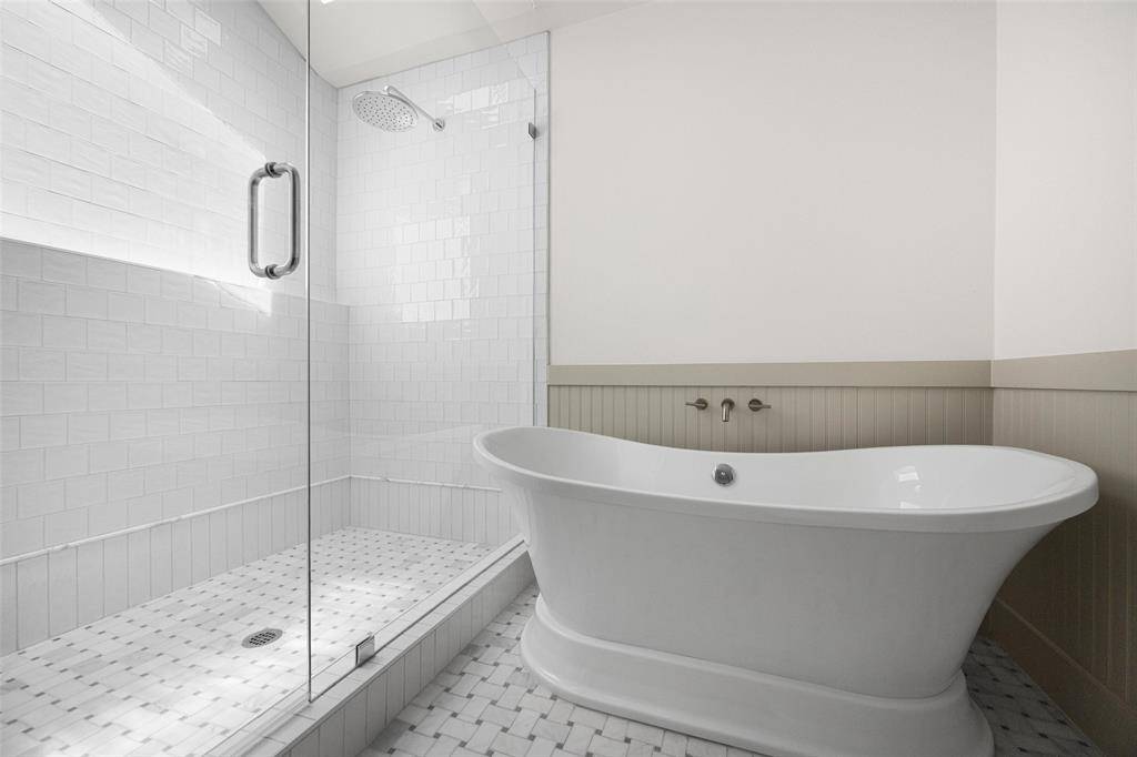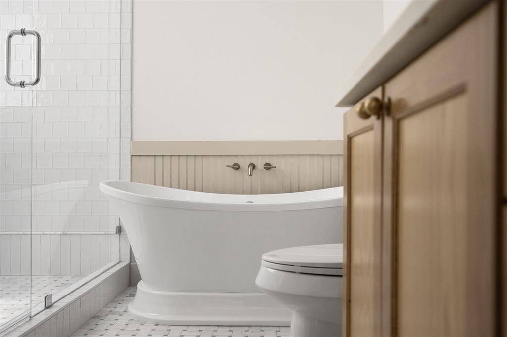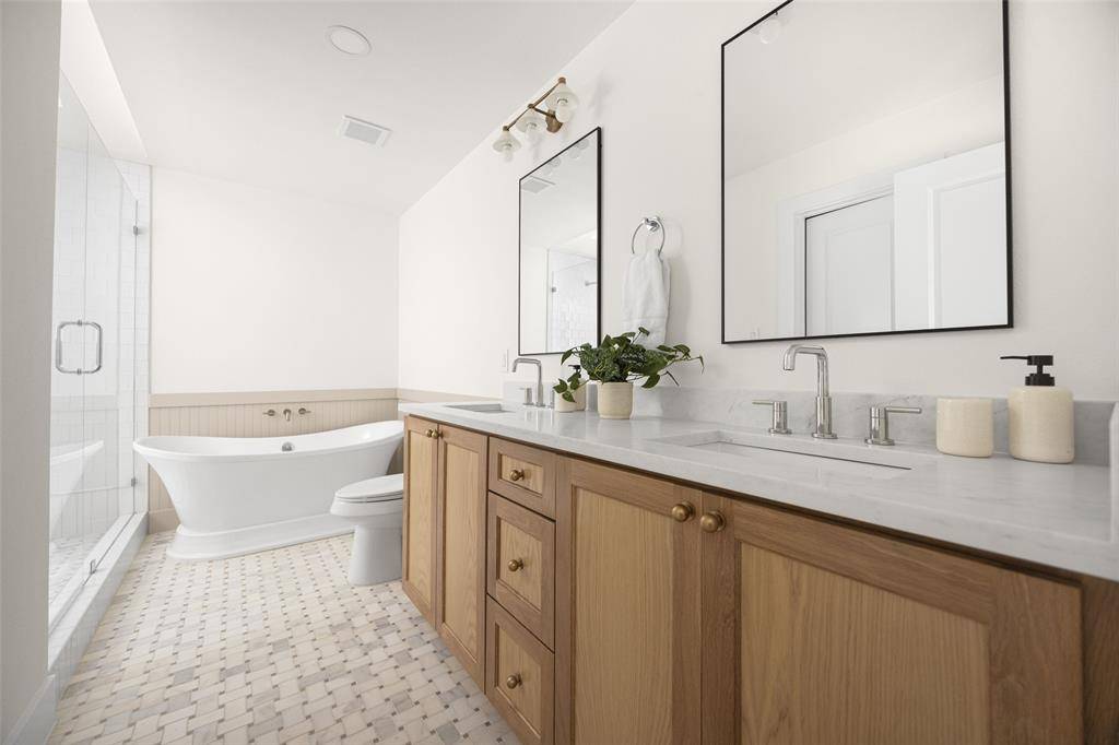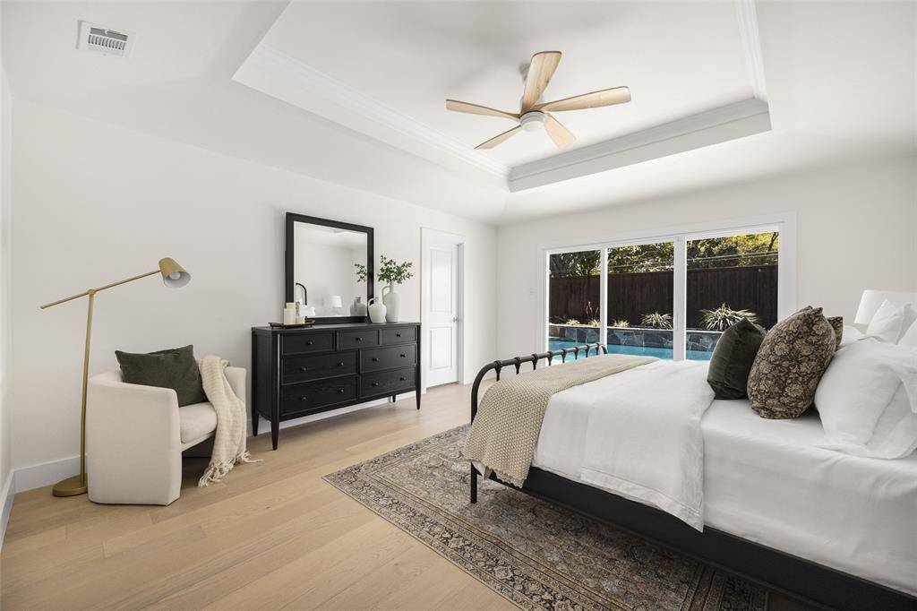 The spacious primary suite is a true retreat, overlooking the serene backyard and pool, and complete with two well-appointed walk-in closets. The spa-like ensuite bath features dual vanities, a soaking tub, and a beautifully designed shower with a skylight that fills the space with natural light.