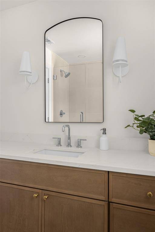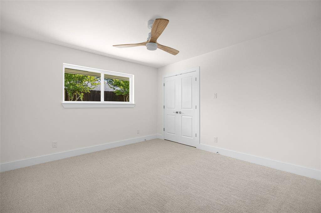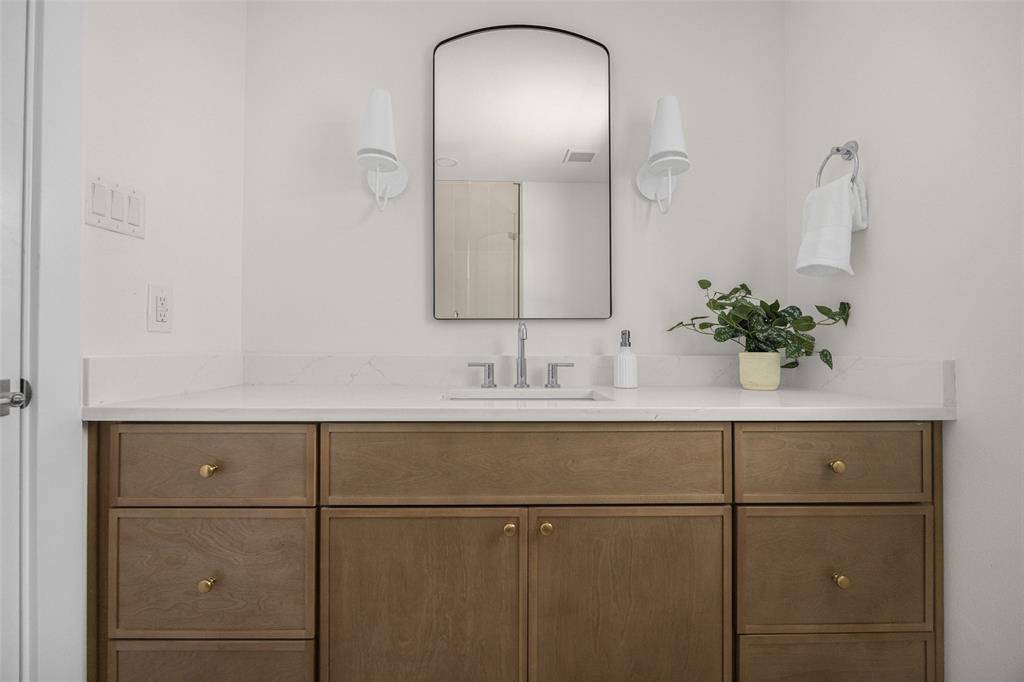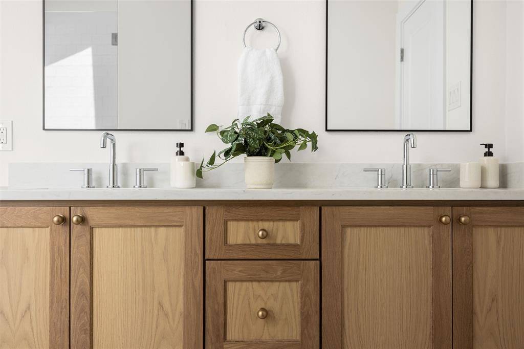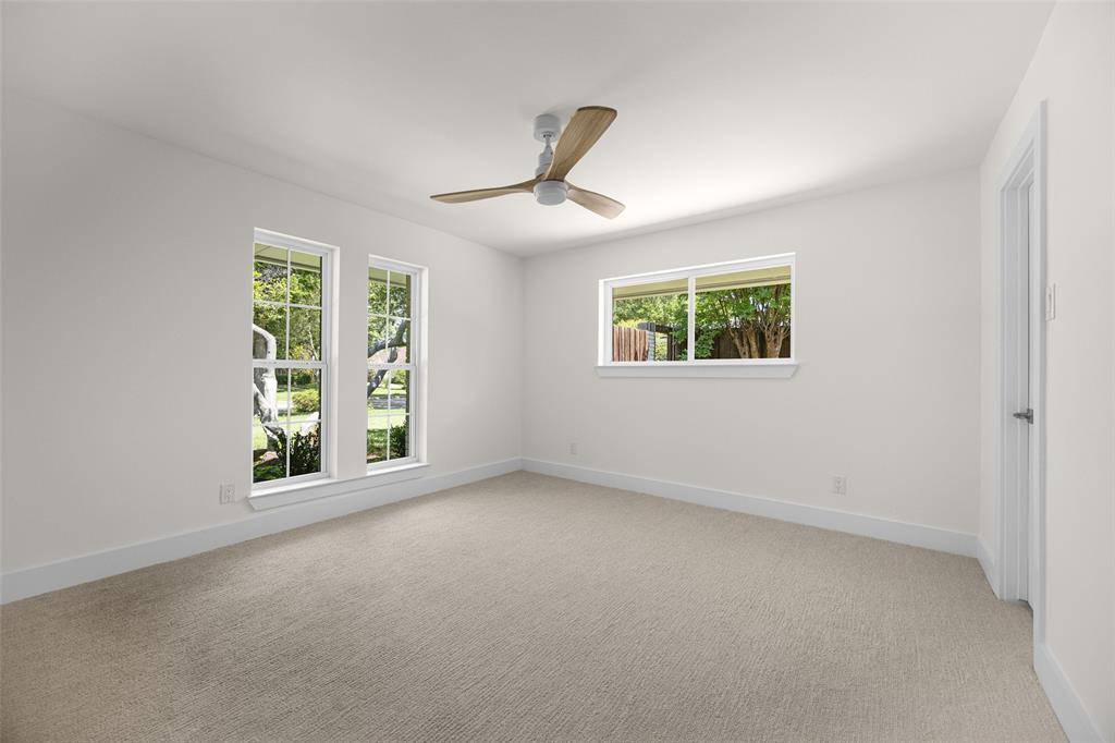 The spacious primary suite is a true retreat, overlooking the serene backyard and pool, and complete with two well-appointed walk-in closets. The spa-like ensuite bath features dual vanities, a soaking tub, and a beautifully designed shower with a skylight that fills the space with natural light.