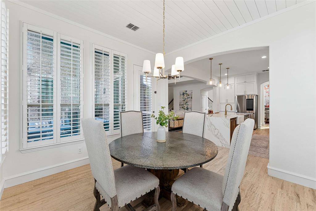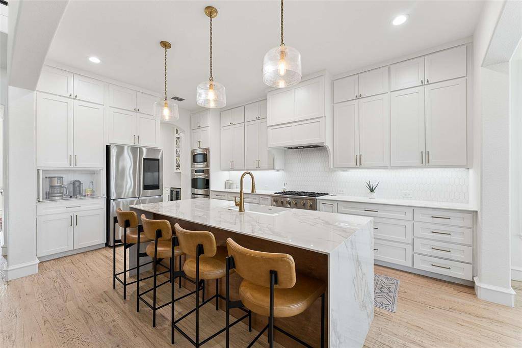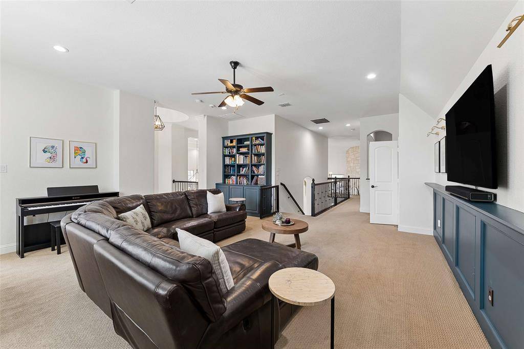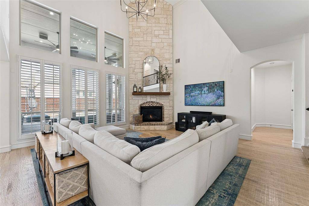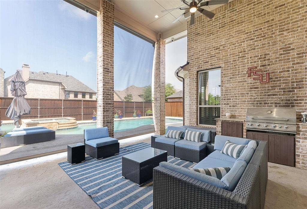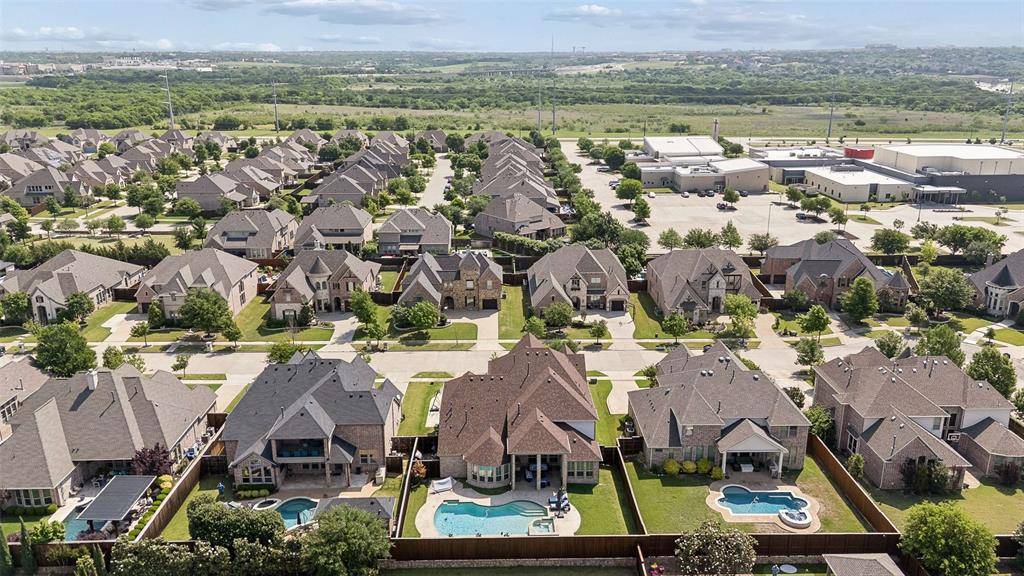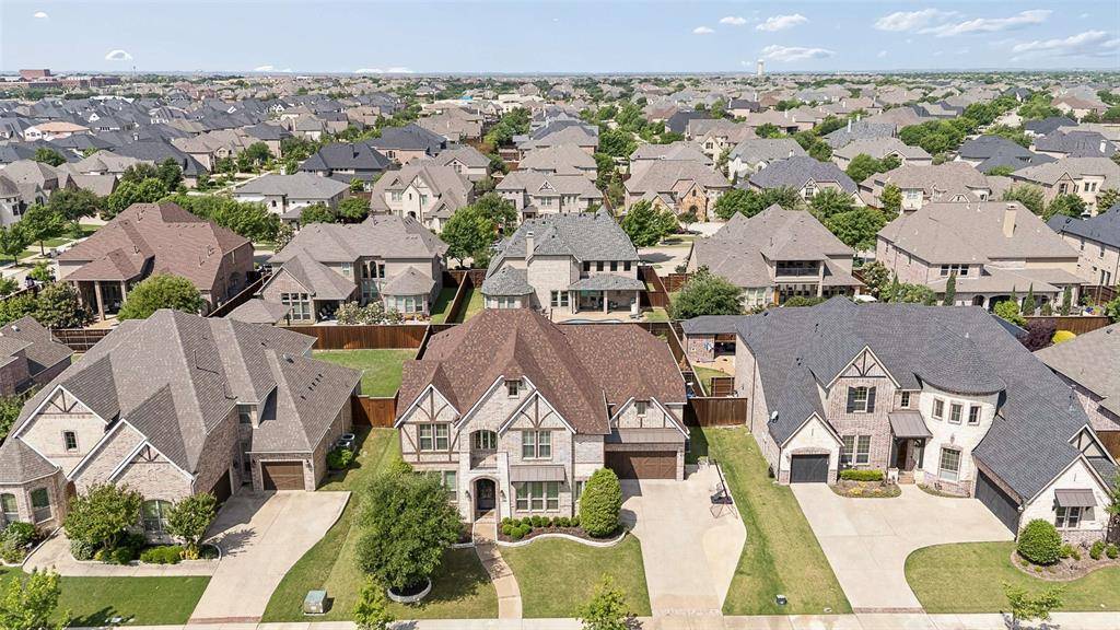 Welcome to Park Place Estates, where timeless design meets modern luxury in a thoughtfully crafted home that offers both elegance and functionality. The open-concept layout is designed for everyday living and effortless entertaining, featuring two bedrooms on the main level—ideal for guests or multigenerational needs—alongside a private study with custom built-ins and a stunning dining room with soaring ceilings. The heart of the home is a chef's dream kitchen, complete with a waterfall island, six-burner range, double ovens, beverage refrigerator, coffee bar, and generous pantry, all flowing seamlessly into a bright breakfast area overlooking serene green space and a spacious living room anchored by a dramatic floor-to-ceiling fireplace. Upstairs, you'll find three additional bedrooms with walk-in closets, a large game room with a custom bar, and a dedicated media room, complemented by professional AV features including built-in speakers, integrated wiring, and security cameras for the ultimate entertainment experience. The primary suite offers a private retreat with a spa-like bath, soaking tub, and expansive custom closets. Step outside to a true backyard oasis featuring a sparkling pool and spa, a covered patio with motorized screens, outdoor TV, built-in grill, and plenty of grassy space for play or relaxation. Located near top-rated schools including Vaughn Elementary School, Pioneer Heritage Middle School, and Wakeland High School (buyer to verify), and just minutes from premier destinations like Legacy West, The Star, PGA of America Headquarters, and Downtown Frisco, this home offers the perfect blend of comfort, convenience, and elevated living.