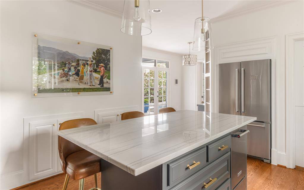 A gracious dining room and sophisticated library office w custom built-ins and window seats provide inviting spaces for gathering or quiet retreat. The light-filled living room features a fireplace and serene views, while the expansive family room is anchored by a fireplace with built-ins and an exceptional wet bar, thoughtfully designed to serve both indoors and directly to the poolside through exterior-facing windows, creating a seamless indoor-outdoor entertaining experience.