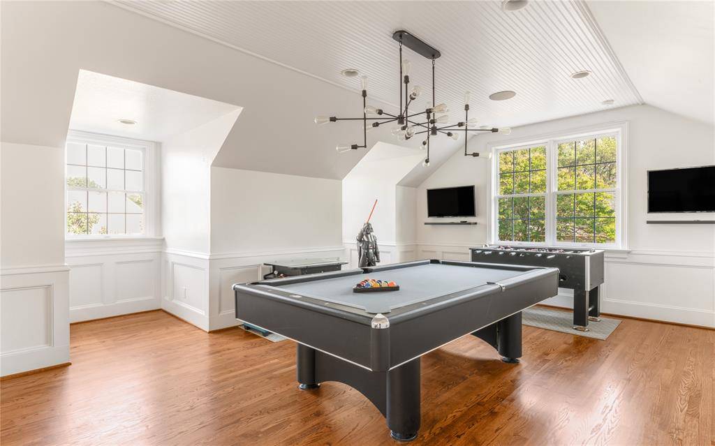 Upstairs, a lofted game room accessed by a second staircase offers remarkable flexibility, wired for multiple screens and spacious enough to accommodate a pool table, foosball, and arcade games, complete with a large storage closet for board games and puzzles. The third floor guest suite provides a private retreat with an ensuite bath and spacious walk-in closet. Walls of windows throughout the home flood the interiors with natural light and frame views of the resort-style oversized pool, turfed backyard, and private putting green.