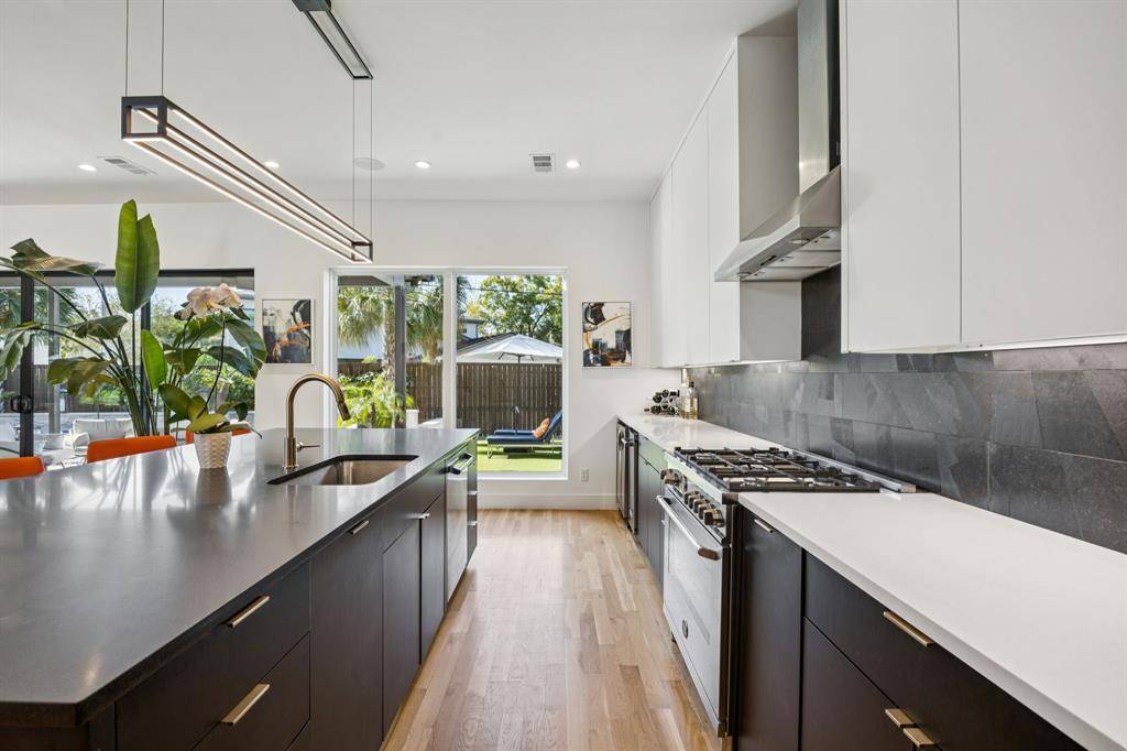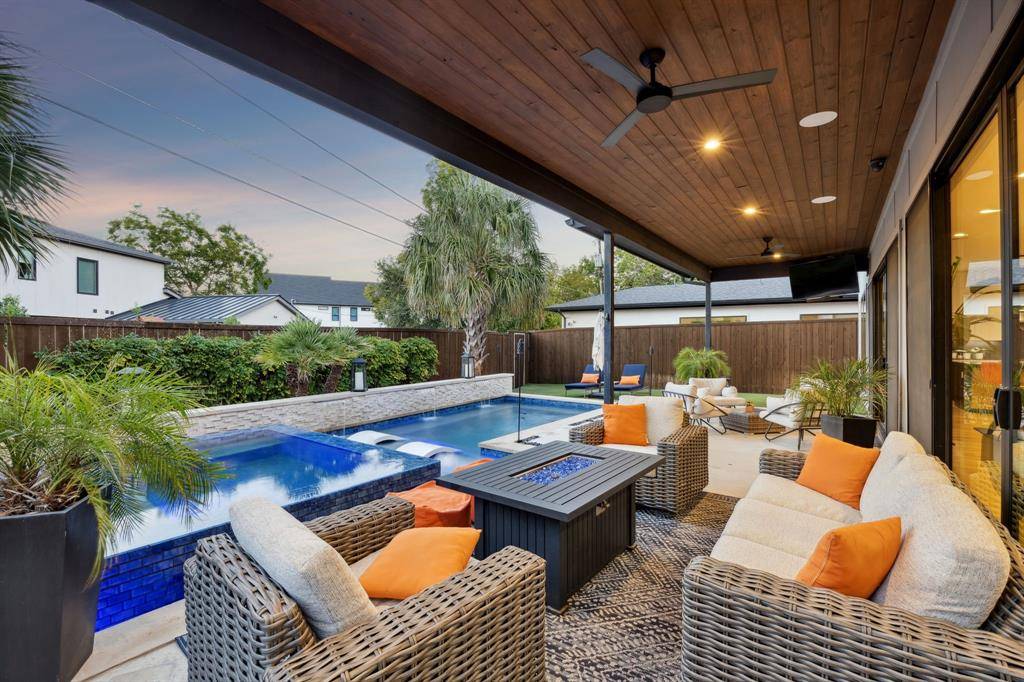 Set behind a private gated entrance, 9733 Mixon offers a sophisticated retreat in the heart of Midway Hollow, blending refined design with effortless indoor-outdoor living. A striking iron door opens to a tranquil courtyard, where a Zen-inspired seating area and built-in grill create a serene introduction to the home.